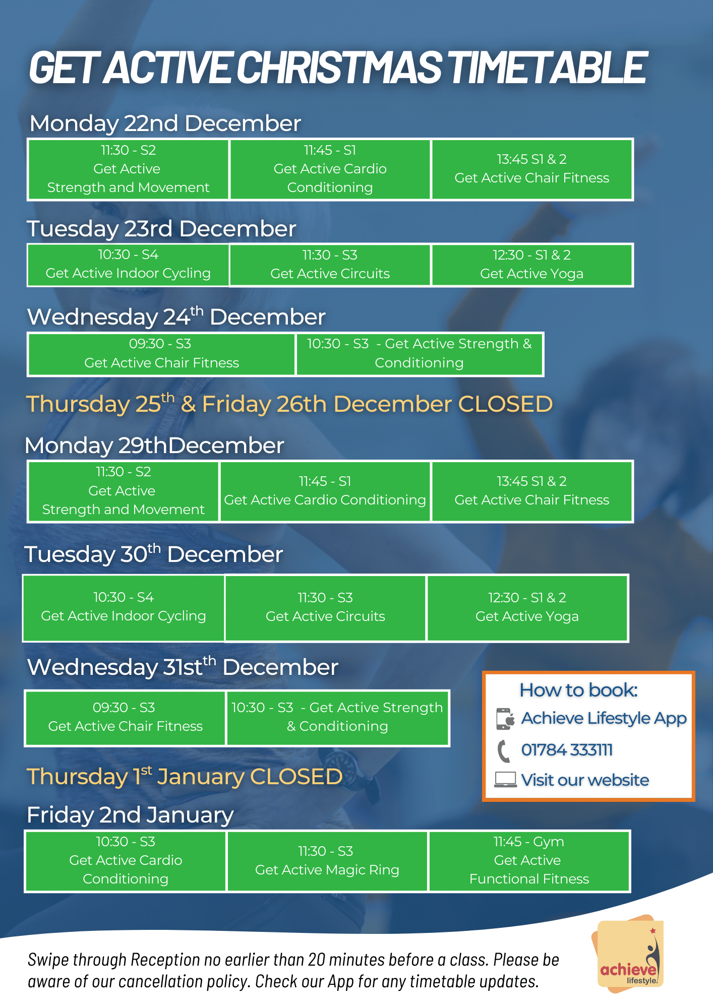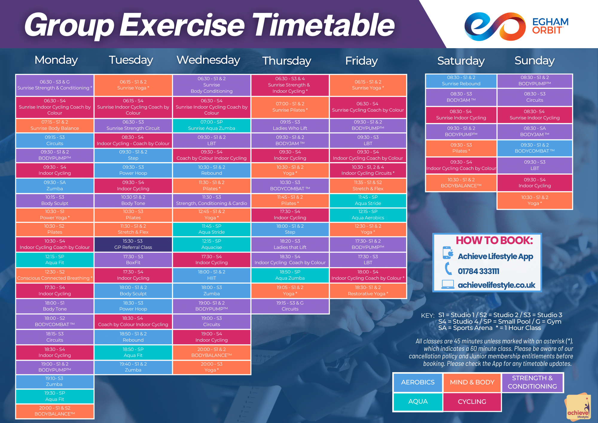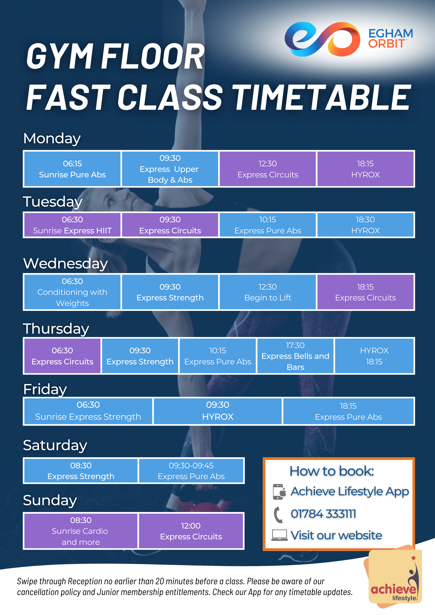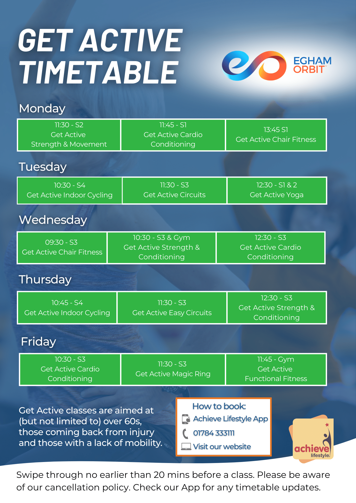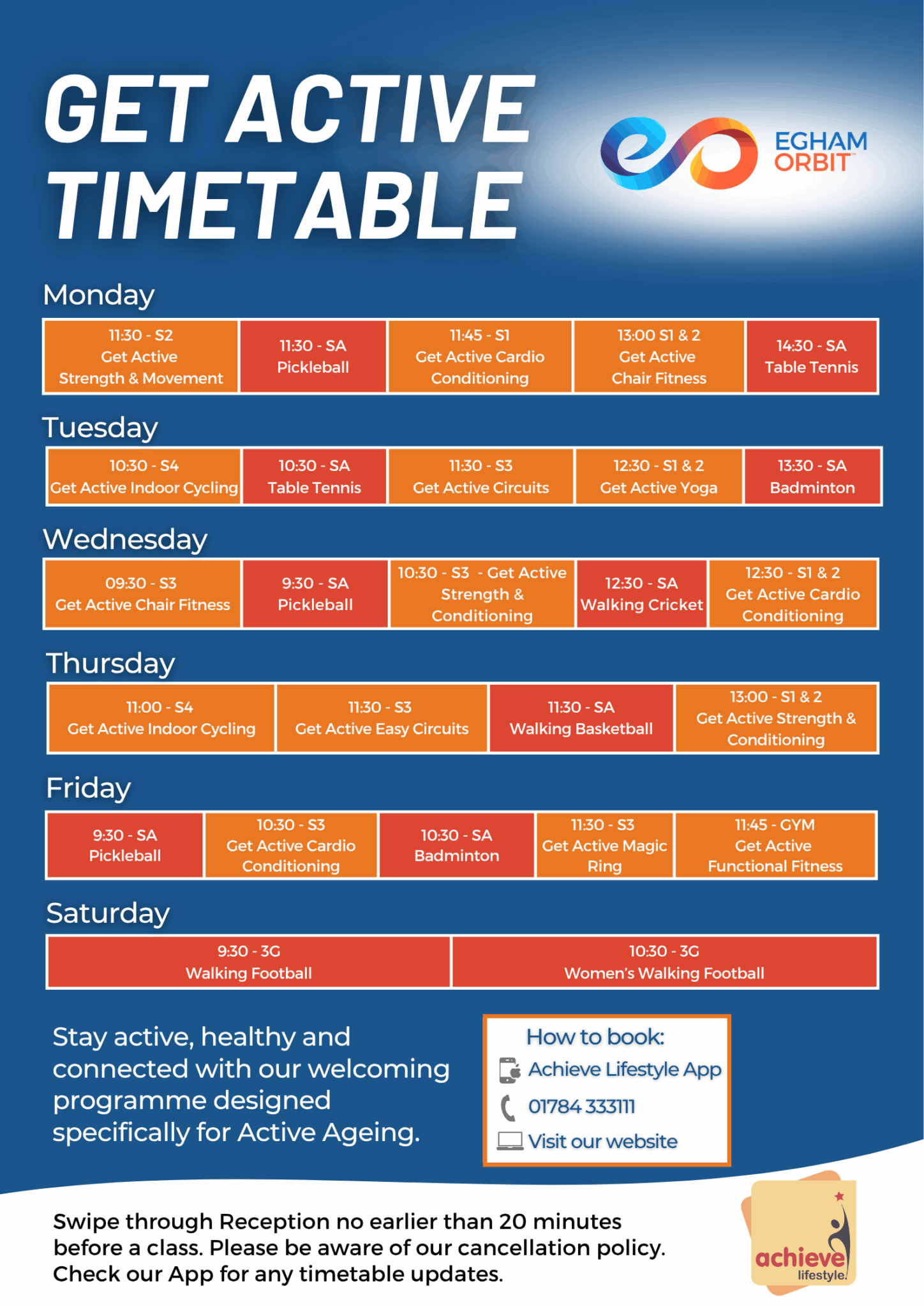 Please book your space in advance online, via the Achieve Lifestyle App or over the phone by calling 01784 333111.